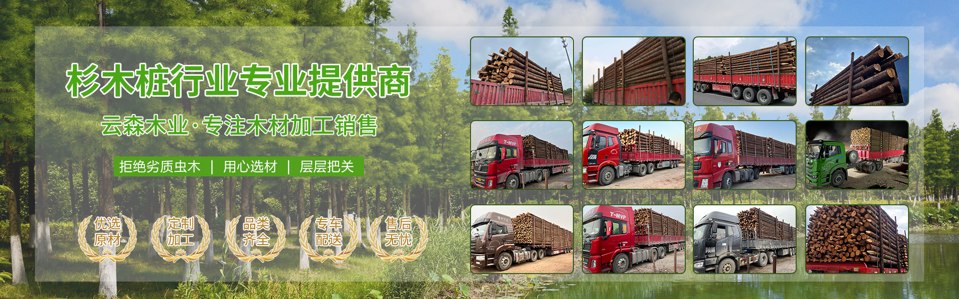 南京市云森木業有限公司位于南京市高淳區。是一家生產加工,線上銷售為一體的現代化企業。擁有完善、科學的質量管理體系及工作團隊。 公司主營松木樁,杉木樁,打樁木,河道木樁,駁岸木樁,防汛木樁,景觀木樁、園林綠化支撐桿等,也可支持方料,木板等木材定制加工產品,所選原材料均為黃山中心林區,樹齡均在三十年左右。質地緊密,樹形優美。 本公司貨源充足,供貨能力強,地處高淳,交通方便利,江浙滬皖送貨上門,當天可達。本著“誠信為本,客戶至上”的經營宗旨,真誠希望與您合作。 歡迎各位客戶前來咨詢,定以優良品質和價格回饋廣大客戶。